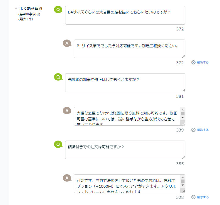 「1人、1匹追加の場合は1500円プラス」や「背景追加で1500円プラス」や「B4サイズ以上で1000円プラス」など、あなたの出品で対応可能なオプションは全て追加していきましょう。