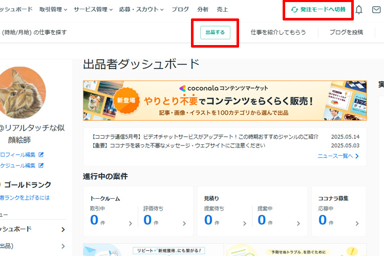 まずココナラでは、自分が発注者にも受注者にもなれて、その切り替えが右上のボタンで簡単にできるようになっています。