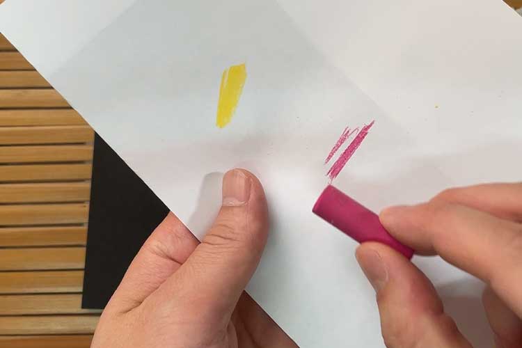 今回の黄色と次に塗る紫っぽいピンクは、色として強調したい大事な2色なので、濃度の高いソフトパステルでしっかり塗って「紙の黒色」を隠蔽しておきましょう。