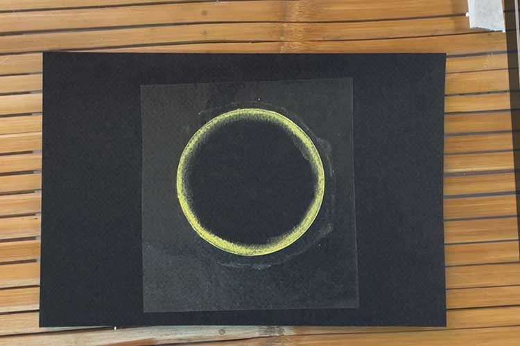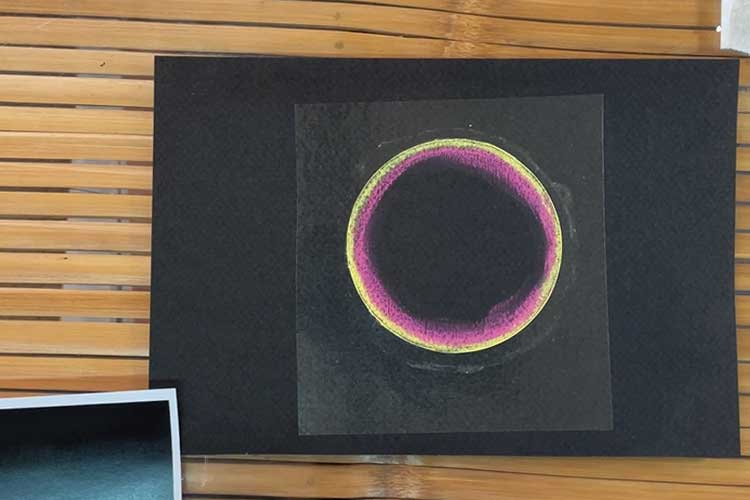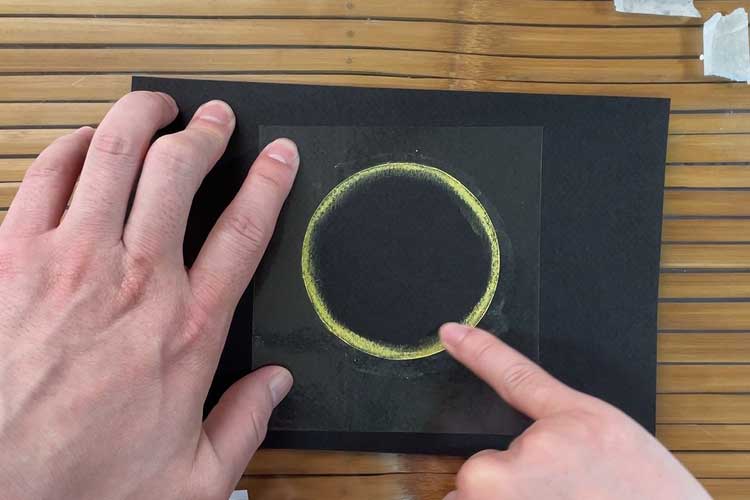 ぐるっと1週、黄色をひいたら小指でなじませます。早速ポイントですが、フィルムの「際きわ」までしっかり粉をなじませておきましょう。きれいな円形を作る上では大切なポイントになります。