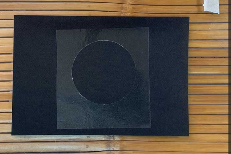 さあ今回はシャボン玉の練習になりますので、ある程度描きやすいサイズの「直径6~7cm」ぐらいに透明フィルムをカットします。カットしたら空気が入り込まないように紙に貼り付けて下さい。