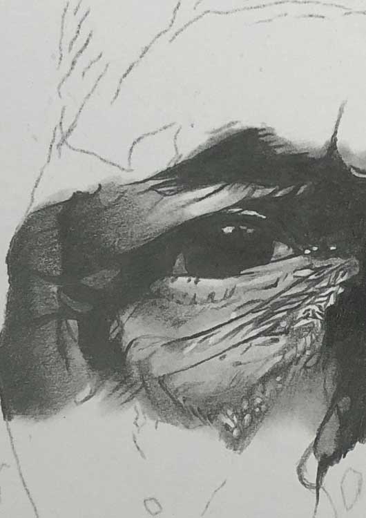 「鼻の端っこの影がここにあるから・・・そうなると影から穴までの形状がどうなっているか・・・うんうんなるほど距離が正確だから形状も読み取りやすいな。描き順もだいたい想像しやすいぞ。