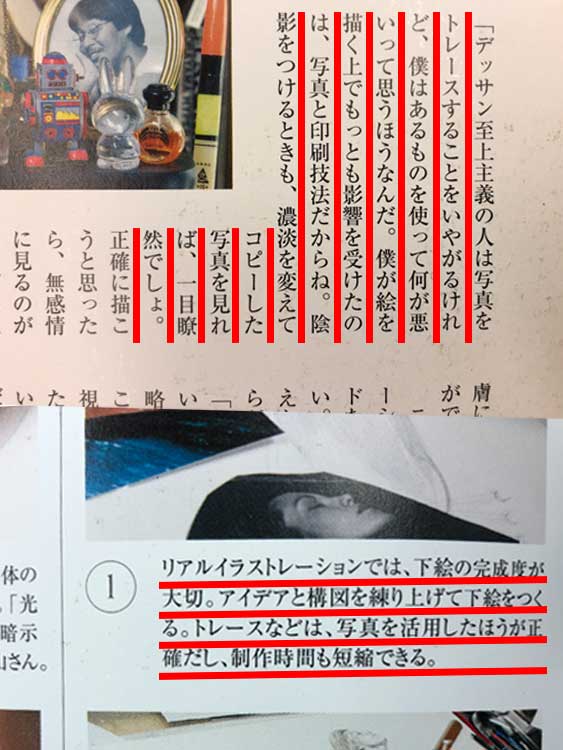 私が当時通っていた原宿の専門学校のプロイラストレーターの講師も「時間短縮の為にトレースを活用している」と言っていました。